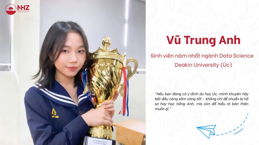 Tham gia Webinar còn có khách mời đặc biệt bạn Vũ Trung Anh, sinh viên năm nhất ngành Data Science tại Deakin University, đã mang đến những câu chuyện chân thực về cuộc sống sinh viên và những lời khuyên hữu ích cho các bạn đang có ý định du học Úc.
